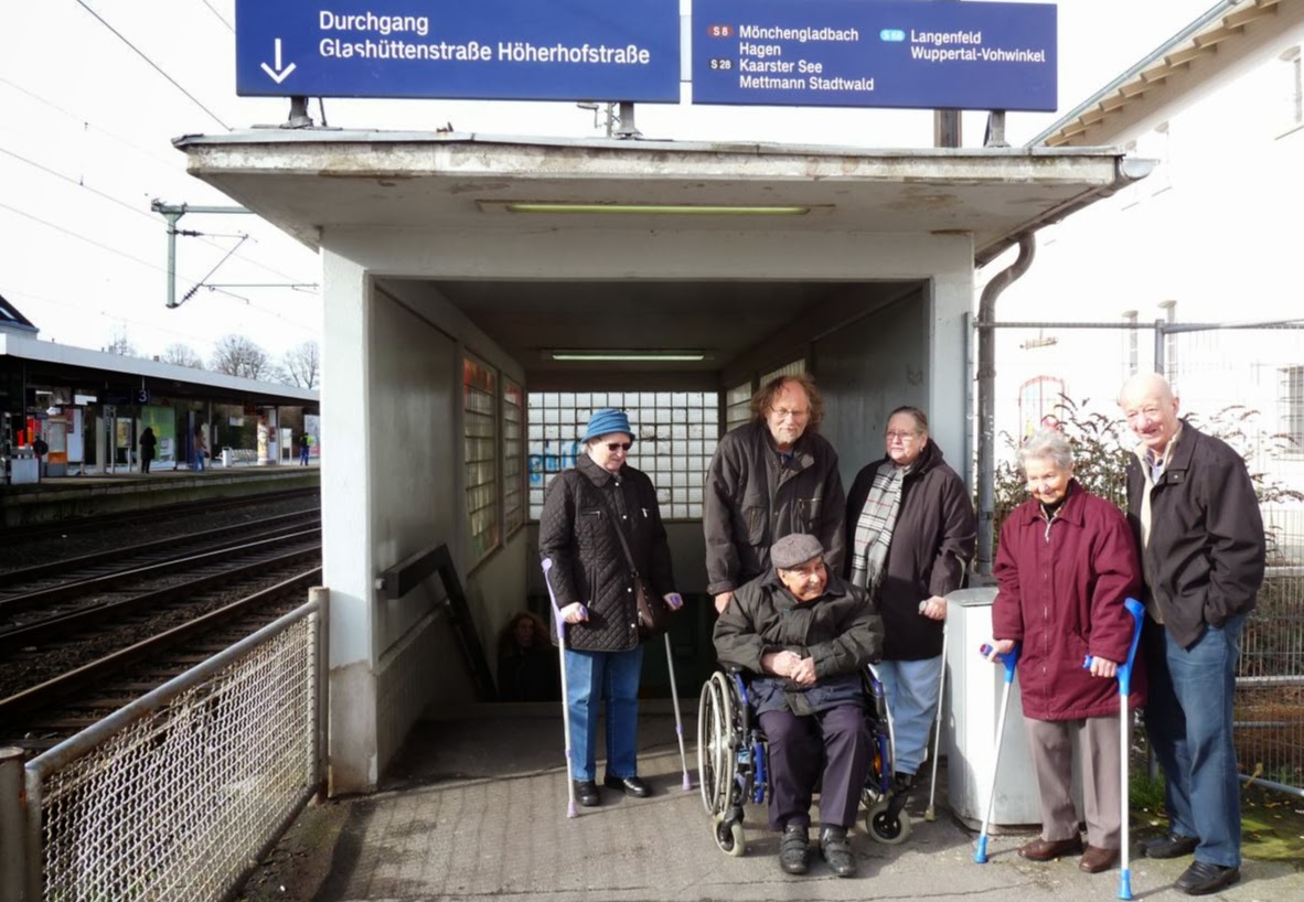 Menschen mit Gehhilfen oder im Rollstuhl vor der Treppe des Gerresheimer Bahnhofs.