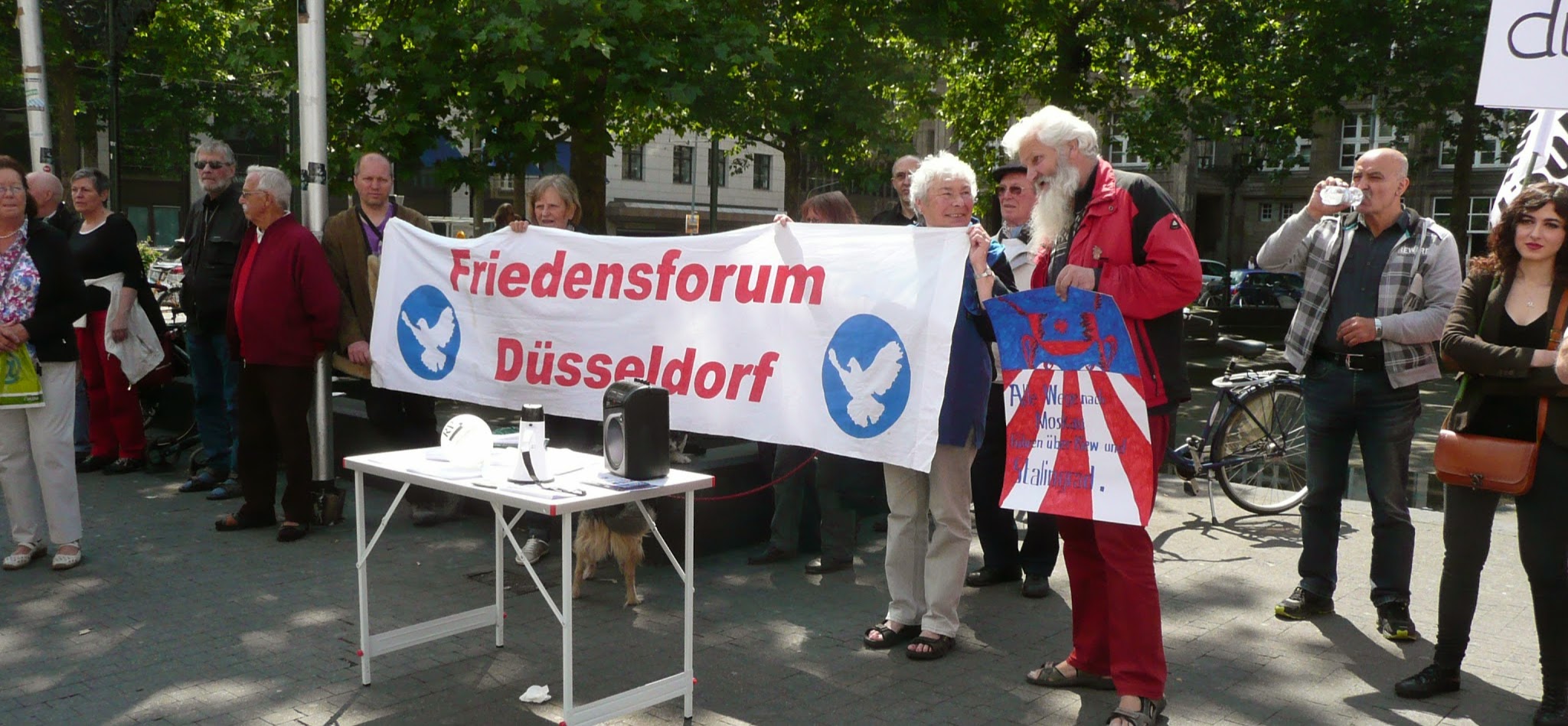 31. Mai 2014 | In Düsseldorf fand auf Initiative des Düsseldorfer Friedensforums eine Mahnwache vor dem CarschHaus am Rande der Altstadt statt. Es kamen gegen 50 engagierte Menschen aus vielen verschiedenen Organisationen aus Düsseldorf, Aachen und Solingen. Für's Friedensforum sprach Kurt Bender zur Situation in der Ukraine und die «Berichterstattung» in den hiesigen Medien. Unisono gegen Russland und Putin, um die Stimmung anzuheizen ganz im Sinne der Aussenpolitik der Bundesregierung.